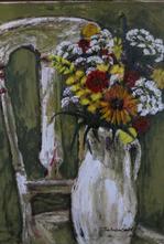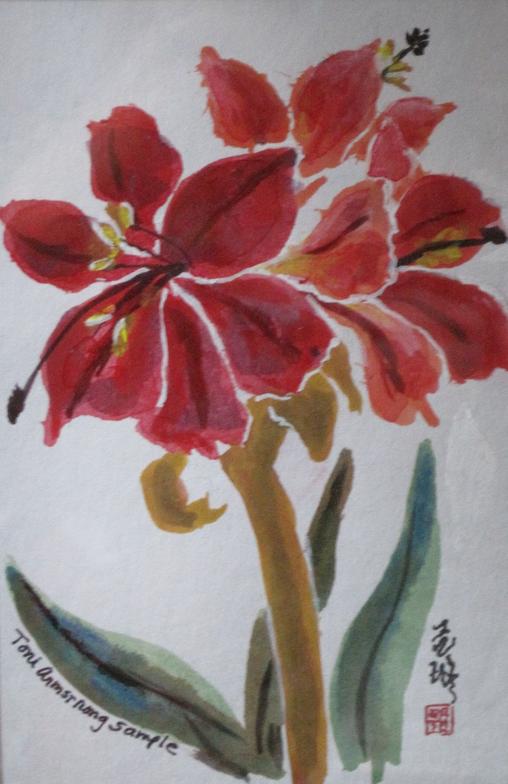 Amaryllis - chinese brush on rice paper; Chair with Flowers - palette knife; Tulips in oils;